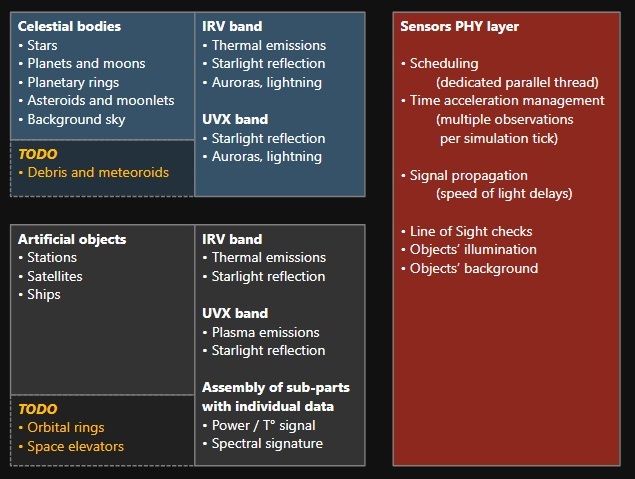 The PHY layer in charge of managing the interactions between the observing sensors and the observable objects is now complete. It can now handle distinct point of views (for instance from the ship and a companion surveillance drone) and multiple observations per simulation tick. The latter modification was necessary to avoid a considerable limitation of the observation frequency at high time acceleration (x 2000 leads to 32 s ticks at 60 fps).