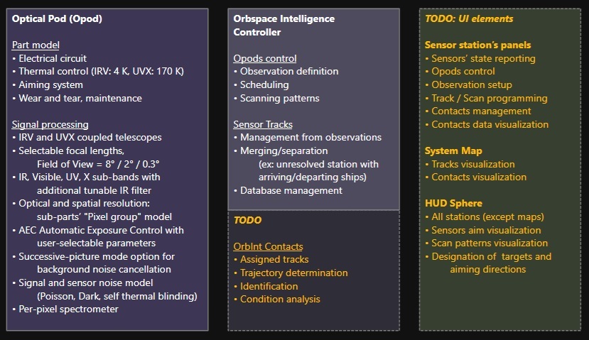 The OIC is the ship’s high-level system in charge of the sensors. It will receive much work in future update but can now pilot the opods and process their returns into “Optical Tracks“. These represent the source data attached to “Contacts” and that will be analyzed to extract information about the target (Trajectory determination, Identification, Condition analysis).